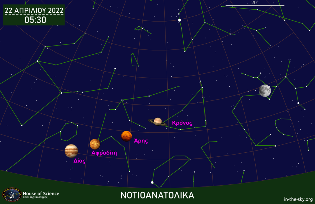 Κατά τις αυγινές ώρες θα έχουμε τη δυνατότητα να απολαύσουμε ένα όμορφο σκηνικό. Γύρω στις 5.00 το πρωί, οι πλανήτες Κρόνος, Άρης, Αφροδίτη και Δίας βρίσκονται ταυτόχρονα στον νυχτερινό ουρανό. Η παρατήρηση μπορεί να γίνει δια γυμνού οφθαλμού καθώς οι συγκεκριμένοι πλανήτες διακρίνονται σχετικά εύκολα στον ουράνιο θόλο. Το μόνο που έχουμε να κάνουμε, για να απολαύσουμε το συγκεκριμένο σκηνικό, είναι να στρέψουμε το βλέμμα μας στα νοτιοδυτικά λίγο πριν την ανατολή του Ήλιου (βλέπε σχήμα 2).