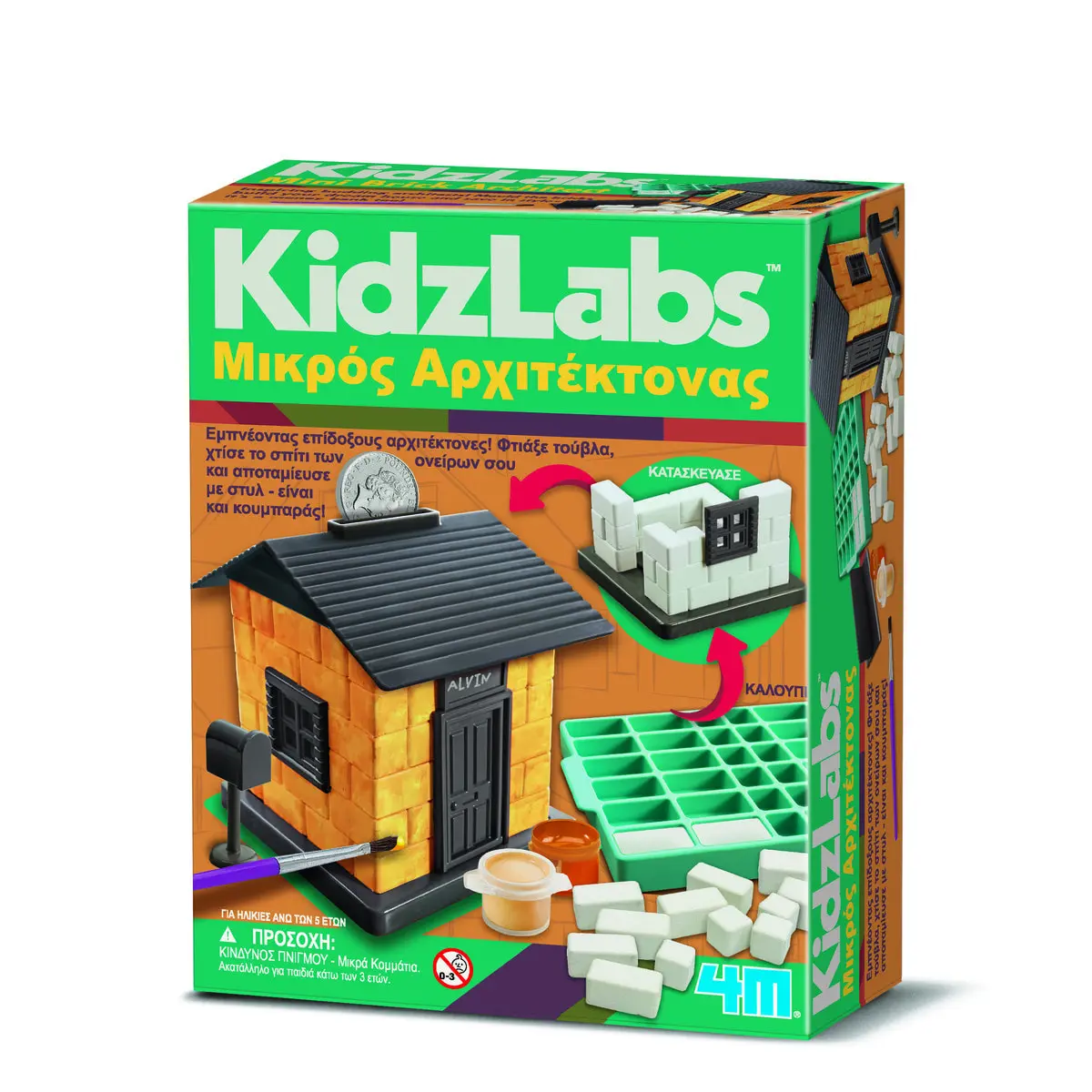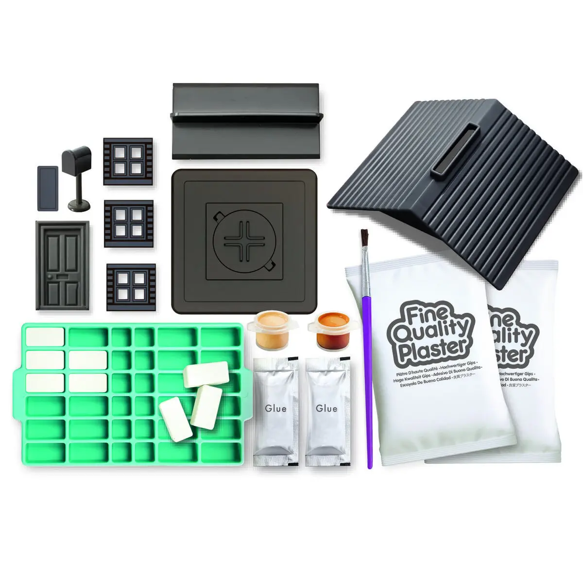 CONTENTS: brick mold x 1, plaster powder x 2, piggy bank base x 1, piggy bank lid x 1, door x 1, trowel x 1, windows x 3, mailbox x 1, name plate x 1, paint strip x 1, roof x 1, paintbrush x 1, EVA glue x 2. Also required, but not included in the package: a mixing bowl, a stirrer.