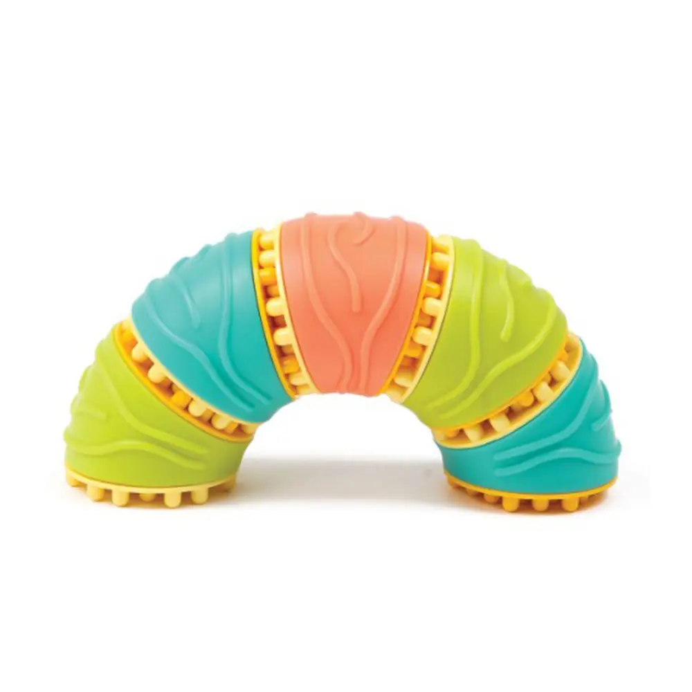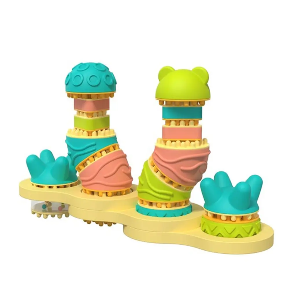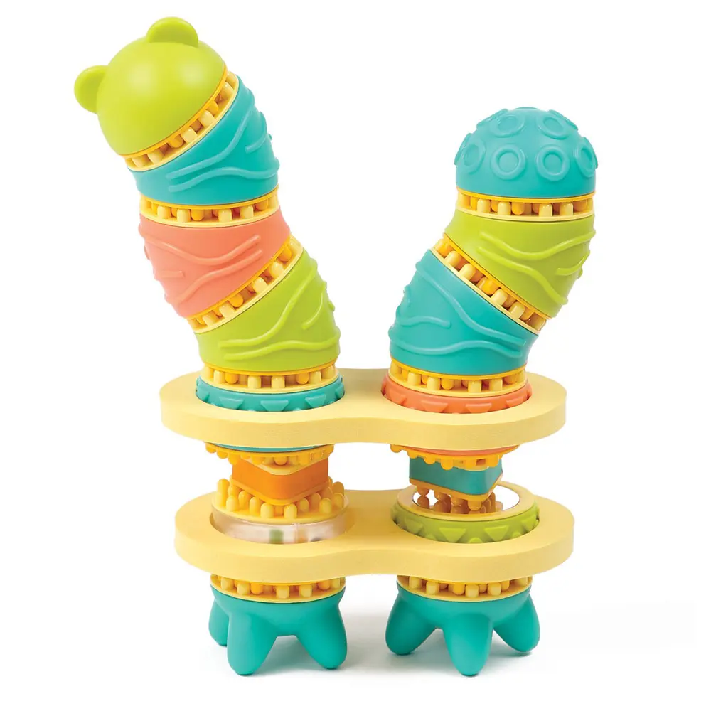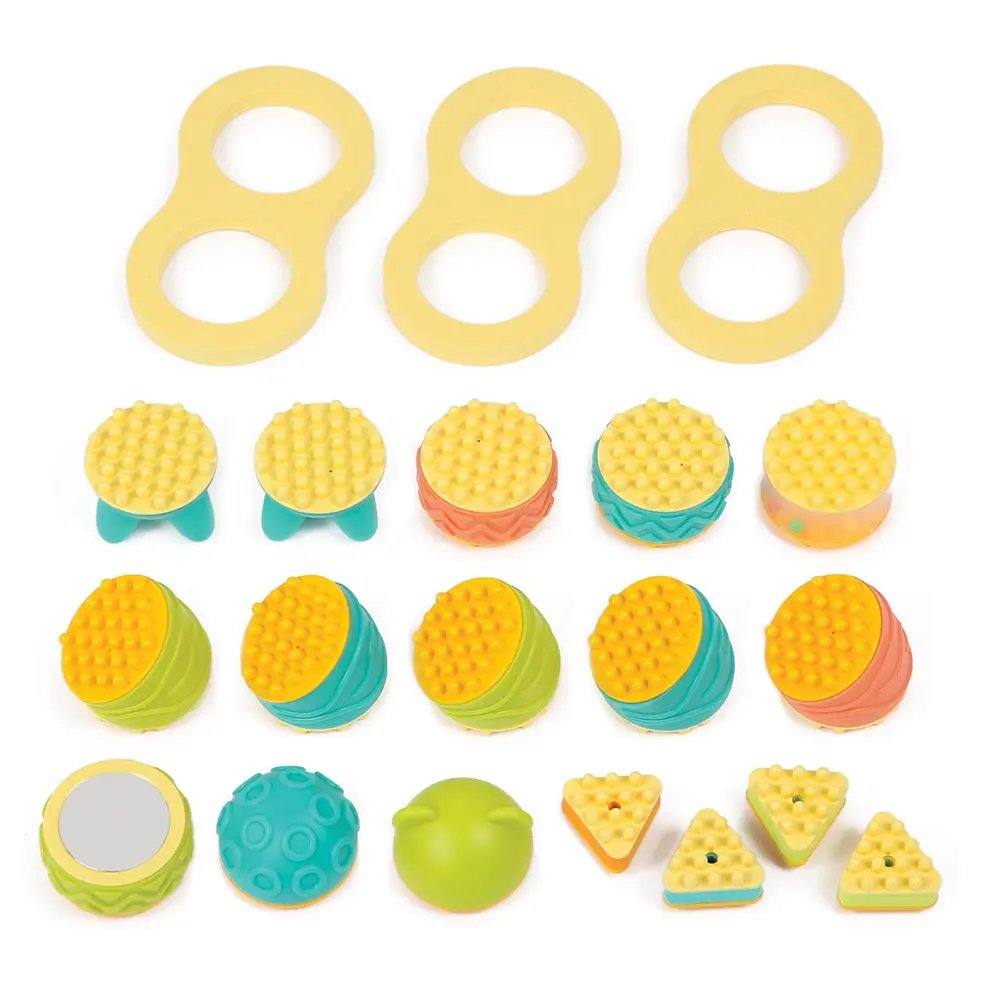 Περιλαμβάνει 20 αισθητηριακά τουβλάκια…τα ‘picotons’. Αυτό που τα κάνει τόσο ξεχωριστά είναι το ιδιαίτερο σχήμα τους, που προσφέρει αμέτρητους τρόπους συνδυασμού για τη δημιουργία φανταστικών οριζόντιων και κάθετων κατασκευών όπως πύργοι, ζώα, φυτά, καμάρες, κτίρια και πολλά άλλα. Κάθε τουβλάκι διαθέτει αρσενική ή θηλυκή υποδοχή προκειμένου να παρακινηθούν τα παιδιά να παρατηρήσουν ποια κομμάτια μπορούν να συνδεθούν μεταξύ τους. Σε κατάλληλο μέγεθος και σχήμα για τα μικρά χεράκια, είναι ειδικά σχεδιασμένα για να αναπτύξουν τις λεπτές κινητικές δεξιότητες των παιδιών ενώ η απαλή τους υφή, τα έντονα χρώματα και τα γεωμετρικά σχήματα στην επιφάνειά τους, κεντρίζουν ακόμη περισσότερο το ενδιαφέρον των παιδιών, ενώ διεγείρουν την αίσθηση της αφής. Κάθε στοιχείο έχει σχεδιαστεί τέλεια για να ενθαρρύνει μια συγκεκριμένη δράση: στοίβαξη, εξισορρόπηση, κύλιση, σύνδεση, ζυγοστάθμιση κ.λπ. Η συσκευασία περιέχει: 1 τουβλάκι με καθρέφτη, 1 διάφανο τουβλάκι με μικρές χάντρες, 2 τουβλάκια με ποδαράκια, 2 στρογγυλεμένα τουβλάκια, 5 τουβλάκια εξισορρόπησης, 4 μικρά τριγωνικά τουβλάκια, 3 συνδετικά τεμάχια από αφρώδες υλικό, 2 επίπεδα στρογγυλά τουβλάκια. Όλα είναι αδιάβροχα και μπορούν να πλυθούν στο χέρι.
